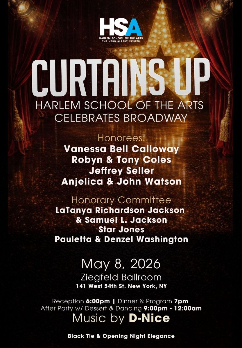 We’re delighted to invite you to Harlem School of the Arts’ Annual Benefit Gala, Curtains Up: Harlem School of the Arts Celebtates Broadway on Friday, May 8, 2026, at the iconic Ziegfeld Ballroom in New York City. The evening begins at 6:00 PM with a sparkling reception, followed by a show-stopping dinner and Gala program at 7:00 PM, and will end with a high-energy after-party with decadent desserts and dancing, featuring the iconic D-Nice.